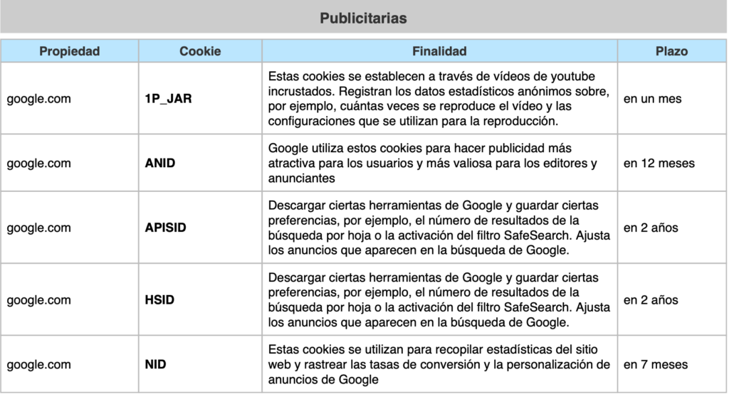 Cookies publicitarias: son aquellas que permiten la gestión, de la forma más eficaz posible, de los espacios publicitarios que, en su caso, el editor haya incluido en una página web, aplicación o plataforma desde la que presta el servicio solicitado en base a criterios como el contenido editado o la frecuencia en la que se muestran los anuncios.
