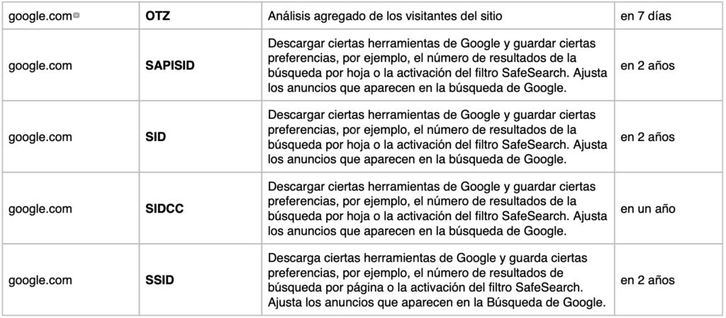 COOKIES UTILIZADAS EN ESTE SITIO WEB